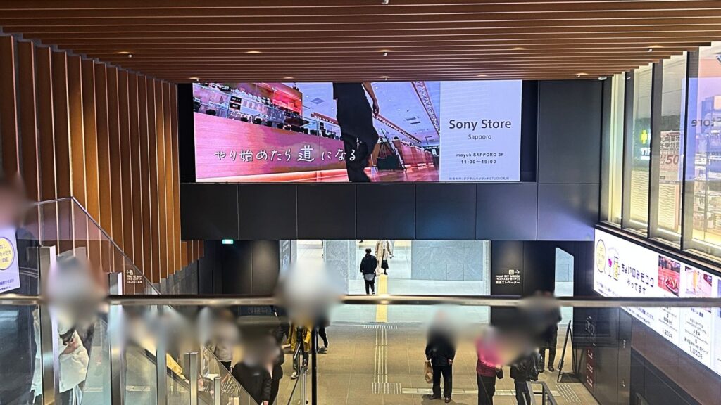 ソニーストア札幌様 出稿ビジョン:ショーウィンドウ 地下~地上間の通行者が多く、特に地上⇒地下へ移動される方はほぼ認知できる大型サイネージ。音声も入れることが出来て訴求しやすい。 サイネージきっかけでの来店数が多くいらっしゃいます。 ソニーストア札幌様の公式HPはこちら